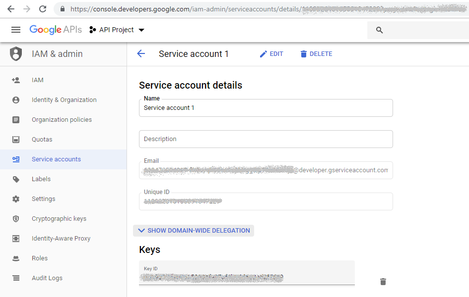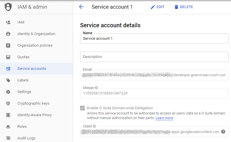 Also, remember the generated value of Client ID (in Domain-wide Delegation section) which is SomeID.apps.googleusercontent.com. The e-mail address of the service account will be SomeID@developer.gserviceaccount.com. SomeID itself looks like 01234567890-j348a3hnsd8923hs78mkdu3no5i2dk72.